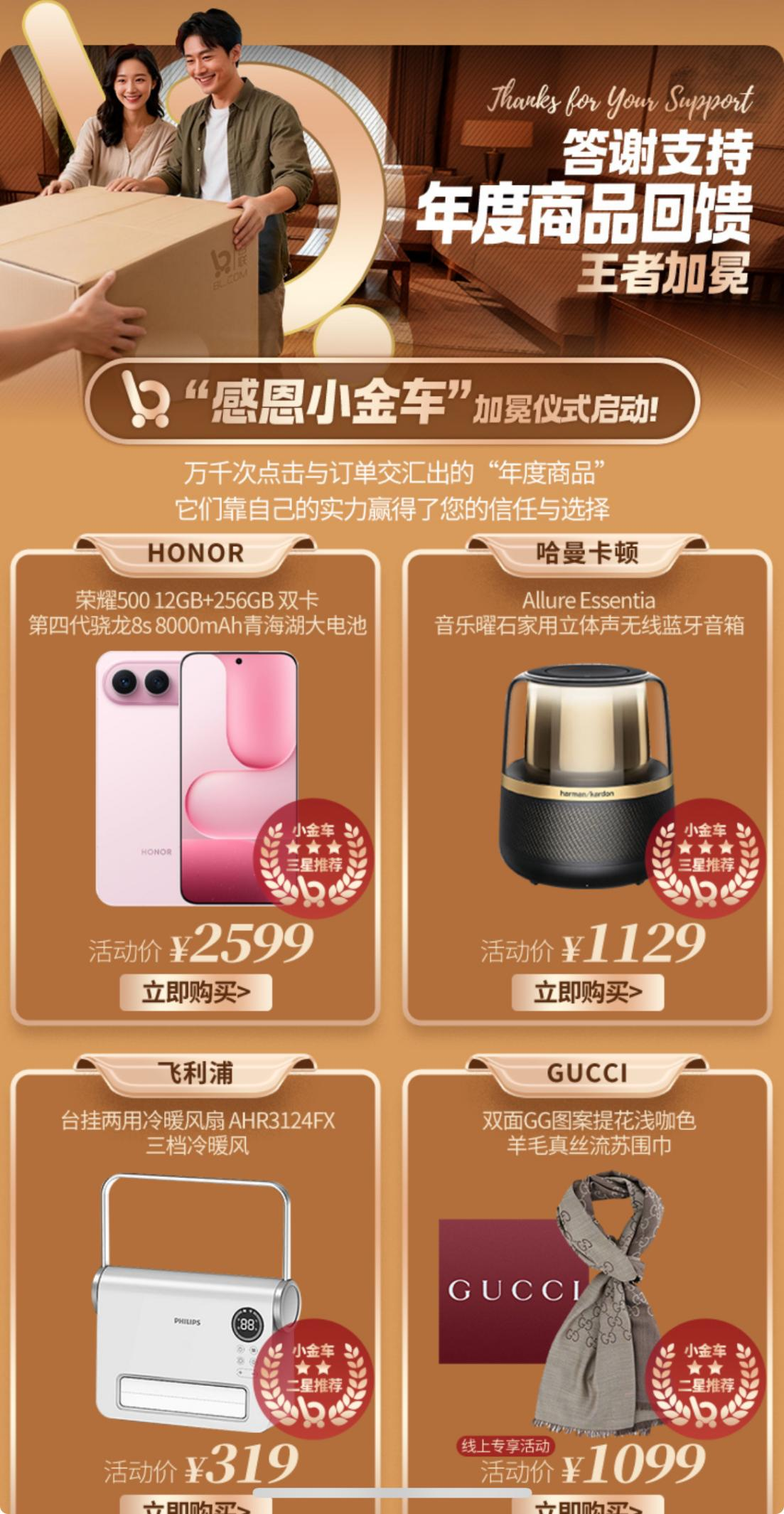 为回馈消费者的长期支持,i百联特别启动“感恩小金车”加冕仪式,聚焦万千订单与点击印证的年度爆款商品,打造专属回馈专场。其中涵盖荣耀500 12GB+256GB手机,搭载第四代骁龙8s芯片与8000mAh青海湖大电池,性能与续航双重在线;Allure Essentia音乐曜石无线蓝牙音箱、台挂两用冷暖风扇等家居好物,精准匹配日常需求;还有双面GG图案提花羊毛真丝围巾等精致单品,以及养生壶、豆浆机等实用家居器具,全方位满足品质生活所需。