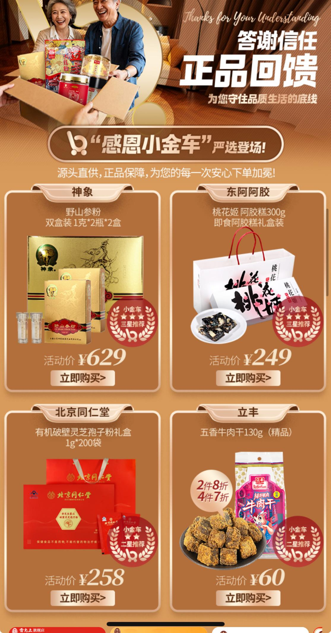 坚守品质底线,方能不负信任。i百联感恩季同步推出正品养生好物专场,源头直供保障品质。北京同仁堂有机破壁灵芝孢子粉礼盒、东阿阿胶桃花姬即食阿胶糕礼盒、野山参粉双盒装等滋补佳品悉数登场,还有立丰五香牛肉干等特色零食,以及西洋参、冬虫夏草等优质养生食材,为消费者的健康生活保驾护航。
